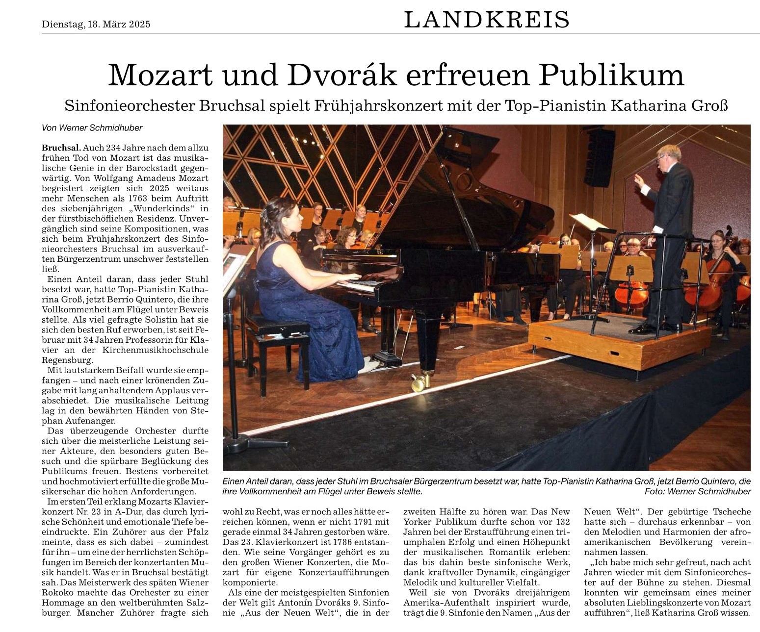 Zu Beginn spielten wir Wolfgang Amadeus Mozarts Klavierkonzert Nr 23 in A-Dur. Unsere Solistin am Klavier war Katharina Berrío Quintero. Mit einer wunderbaren Mischung aus Innigkeit, Leichtigkeit und technischer Brillanz zeigte sie ihr außergewöhnliches Können am Flügel, das sie auch mit ihrer Zugabe - „Jeux d‘eaux“ von Maurice Ravel - unter Beweis stellte.
